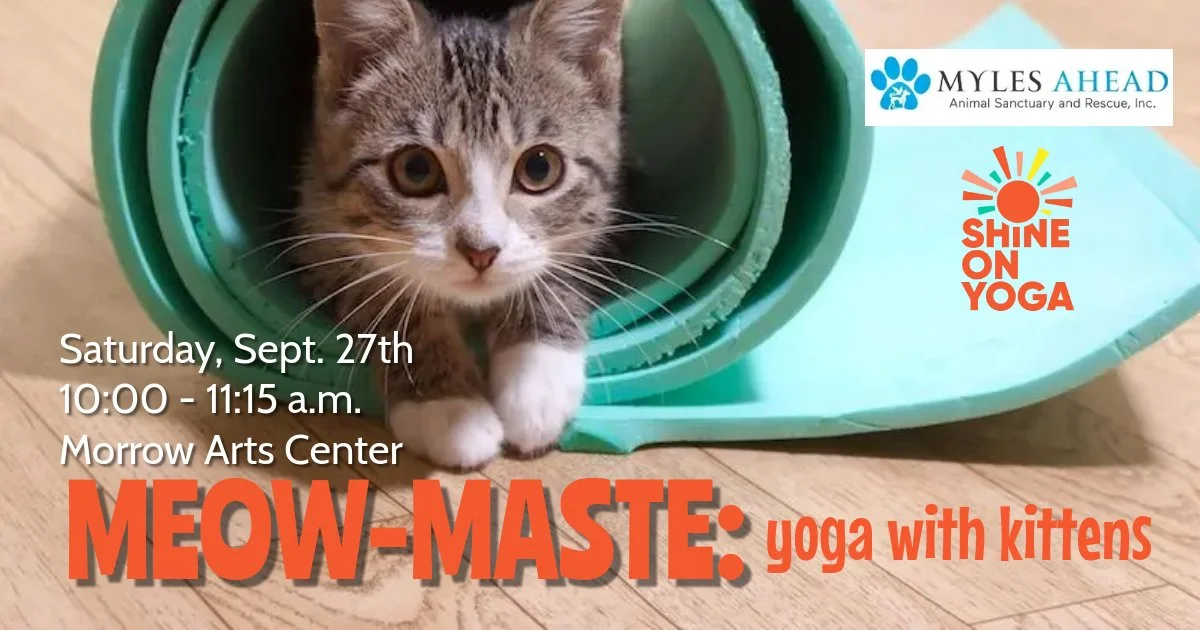 Adorable, adoptable kittens will be in our studio in the Morrow Arts Center to share cuddles for an important cause. All proceeds from this event go straight to the care of the many animals loved by the volunteers at Myles Ahead.